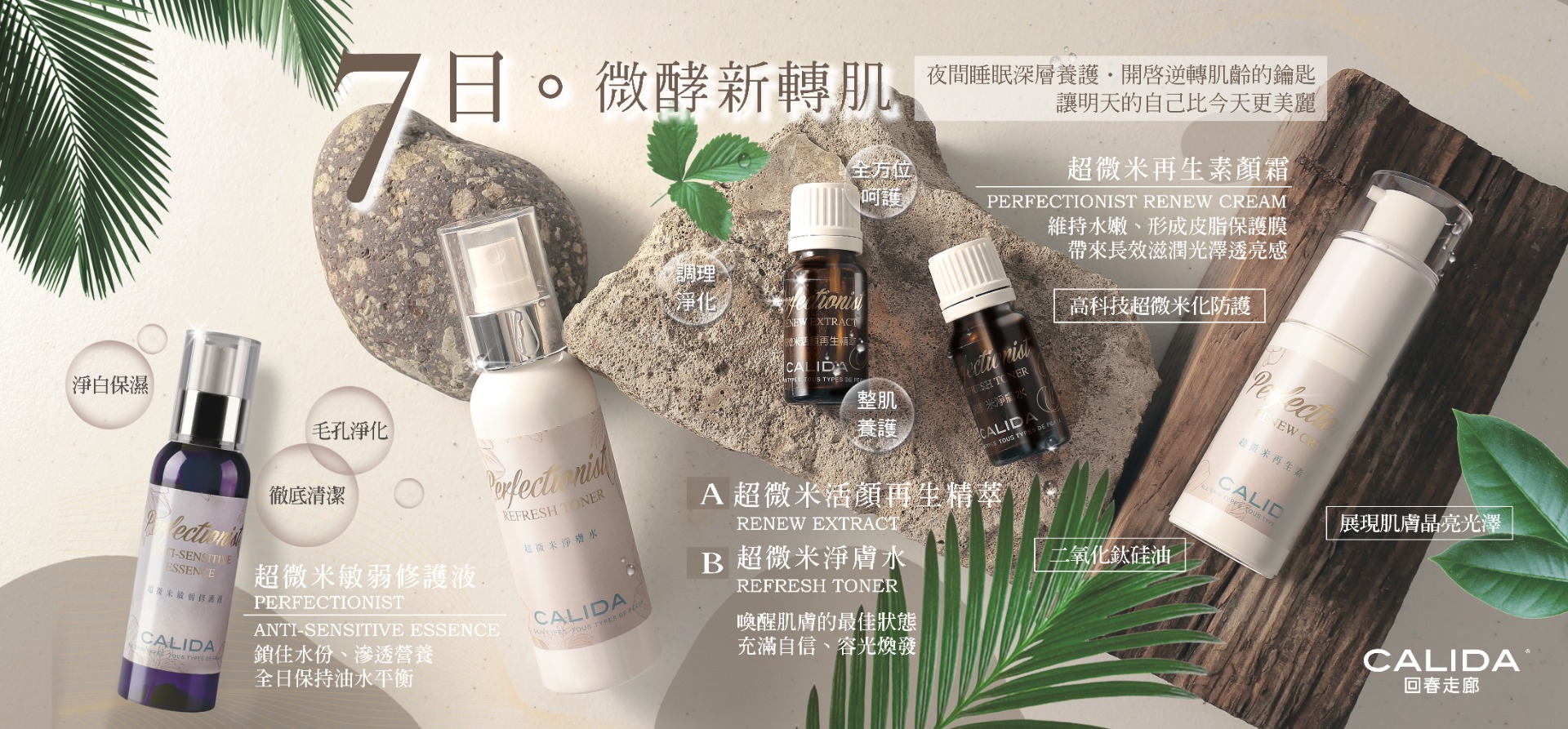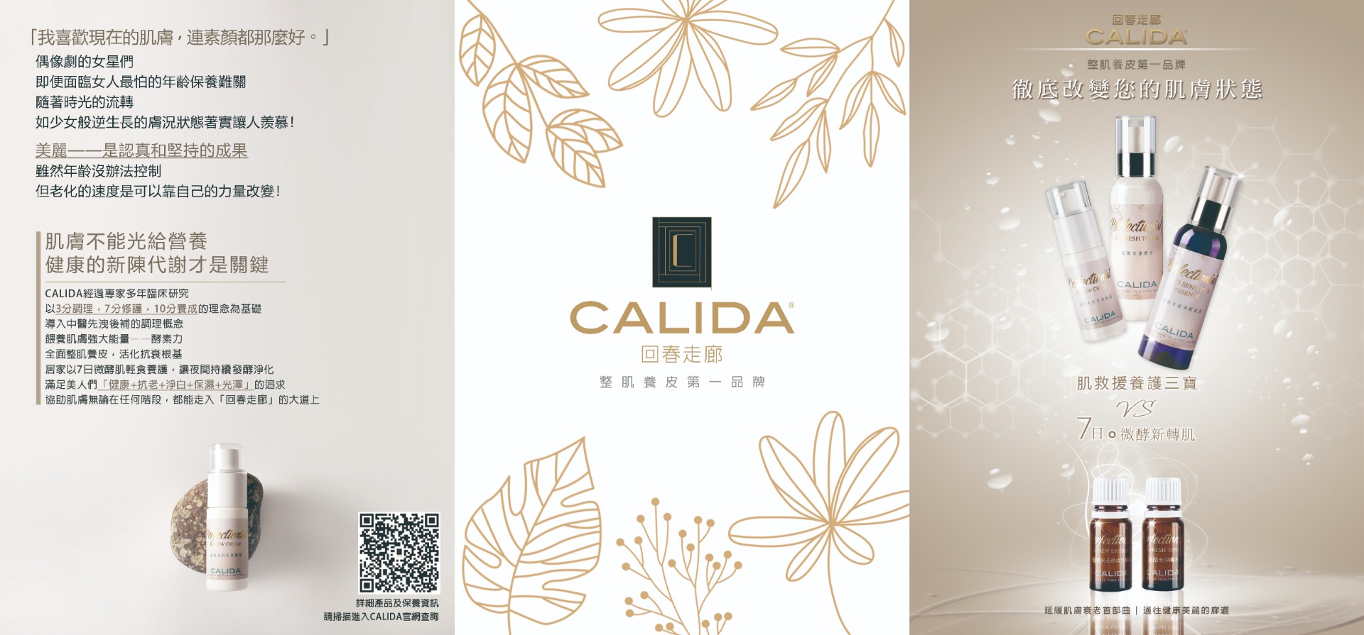 CALIDA為了幫助美人們在保養上遇到皮膚狀況不佳或突破停滯無感的「高原期」,經過專家多年臨床研究成功推出以 3 分治療 7 分修護 10分養成的肌原力養護工程,以中醫先洩後補的調理概念,運用超微米科技包覆特殊植物萃取酵素成分層層餵養肌膚,深入活化肌底同時排除吸收代謝障礙,居家以無負擔的7日肌膚養生主張 - 間歇輕食保養,持續在夜間發酵淨化,全面重置整肌養皮,啟動肌膚健康自癒力,滿足保養對於「健康 + 抗老 + 淨白 + 保濕 + 光澤」的追求,協助肌膚無論在任何階段都走入「回春走廊」大道上。