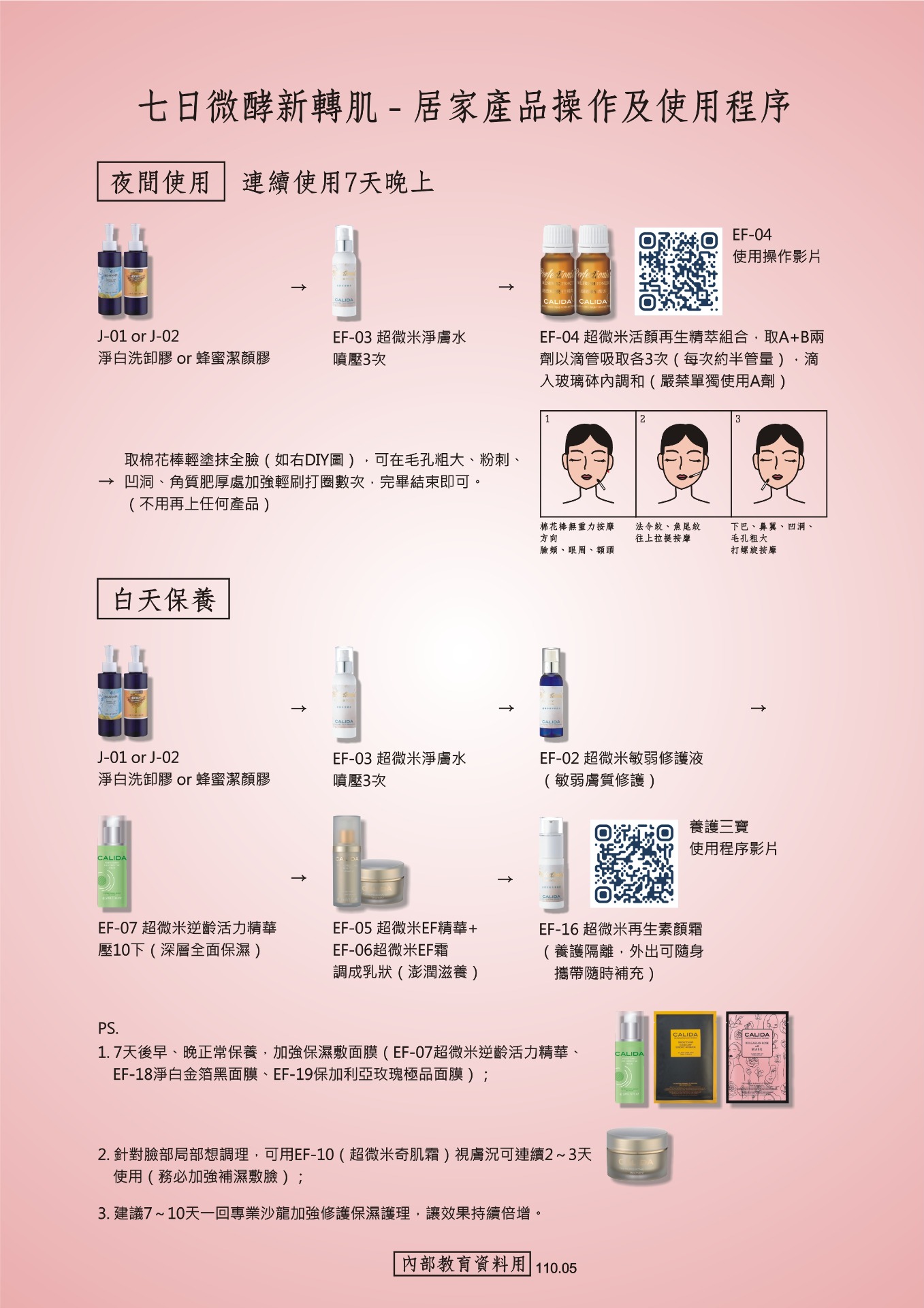 •1. 7天後早、晚正常保養,加強保濕敷面膜(EF-07、EF-18、EF-19);